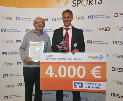In der Hamburger Volksbank fieberten die 2. Vorsitzende Maike Wulff und der Inklusionsverantwortliche Stefan Schlegel vom SV Eidelstedt (SVE) und Daniel Knoblich, Vorstandsvorsitzender des Hamburger Sportbunds (HSB) auf Einladung von Rita Herbers, Vorständin Markt, im kleinsten Kreis mit. Das gezeigte Foto (siehe oben) entstand nach dem Landesentscheid in Hamburg, als der SVE den „Großen Stern des Sports“ in Silber gewonnen hatte.