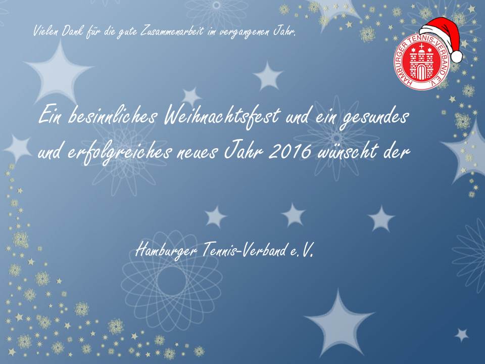 Die Geschäftsstelle des Hamburger Tennis-Verband e.V. ist bis einschließlich 03.01.2016 geschlossen. Ab 04.01.2016 sind wir nur eingeschränkt via E-Mail erreichbar und ab 11.01.2016 wieder wie gewohnt zu den bekannten Büro- und Telefonzeiten einsatzbereit.