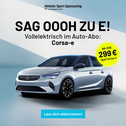 Elektrisierende Angebote gibt’s bei unserem Partner Athletic Sport Sponsoring. Wie wär’s mit einem wendigen Opel Corsa-e oder einem Mokka-e? Jetzt im unschlagbaren Auto-Abo erhältlich! Alle Infos zum Angebot findest du auf www.ichbindeinauto.de.