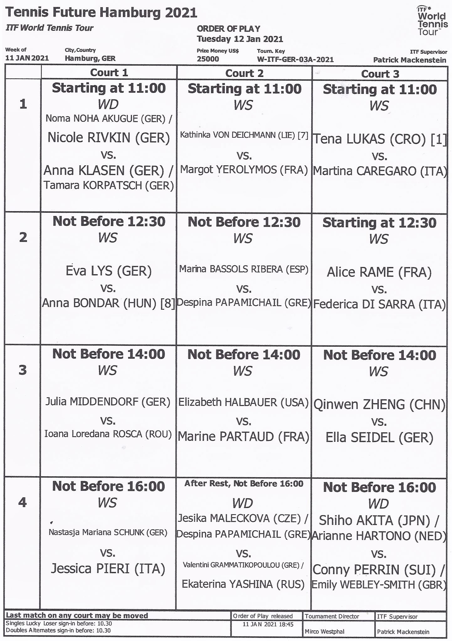 Ergebnisse der Qualifikation und die Hauptfelder der Damen-Einzel und Damen-Doppel sowie den heutigen Spielplan finden Sie zum herunterladen unter Downloads.