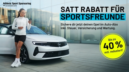 Unser Partner Athletic Sport Sponsoring macht es euch jetzt noch einfacher, unschlagbar preisbewusst im Rundum-sorglos-Paket unterwegs zu sein. Sichert euch jetzt ausgewählte Opel-Modelle zum extragünstigen Preis im Auto-Abo. Nur solange der Vorrat reicht: Schau direkt mal hier rein!