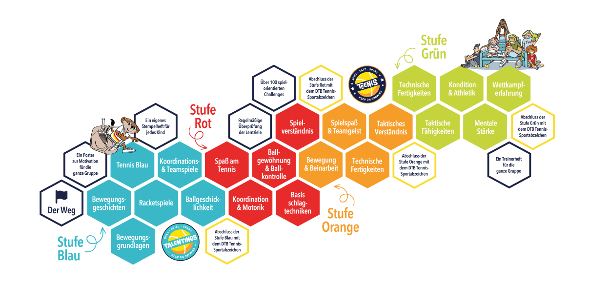 - Für den Abschluss einer Stufe und somit den Übergang in die nächste Stufe empfehlen wir das jeweilige DTB Tennis-Sportabzeichen in der Gruppe umzusetzen.